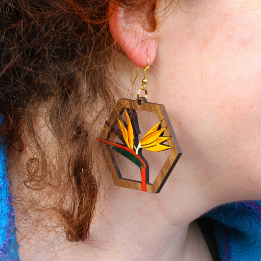 All Bobinsana earrings and pendants are made out of sustainable solid hardwoods. The wood is treated with oils or and/or painted by hand, before being sealed in with a hard wearing polyurethane varnish.
